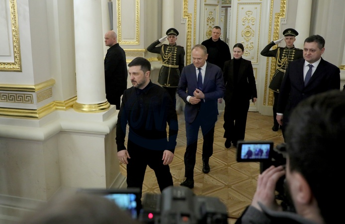 President of Ukraine Volodymyr Zelenskyy and Prime Minister of the Republic of Poland Donald Tusk (L to R) head to sign bilateral documents during their official meeting in Kyiv, Ukraine, on February 5, 2026, Credit:Yuliia Ovsiannikova / Avalon