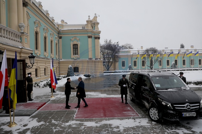 President of Ukraine Volodymyr Zelenskyy (L) welcomes Prime Minister of the Republic of Poland Donald Tusk at the entrance to the Mariinskyi Palace during the Polish leader's official visit to Kyiv, Ukraine, on February 5, 2026, Credit:Yuliia Ovsiannikova / Avalon