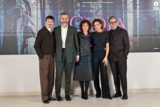 February 5, 2026, Rome. Presentation of the film "La Gioia." Pictured is director Nicolangelo Gelormini and the cast, including Saul Nanni, Valeria Golino, Jasmine Trinca, and Francesco Colella., Credit:Maria Laura Antonelli / Avalon
