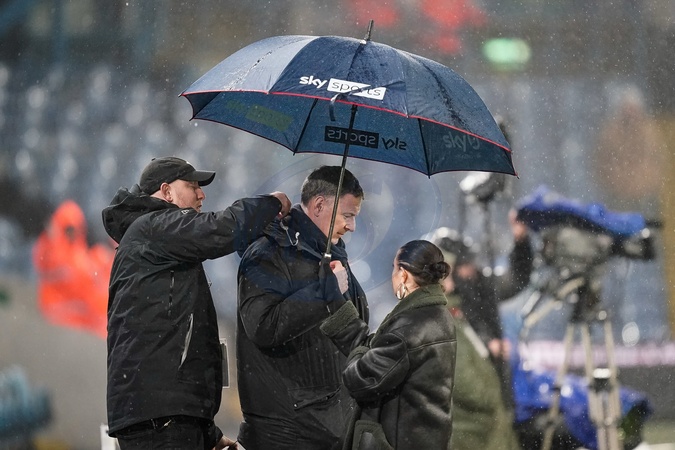 Sky Sports broadcasters and presenters setting up in the rain during the Premier League match Leeds United vs Nottingham Forest at Elland Road, Leeds, United Kingdom on 06 February 2026, Credit:Maynard Manyowa/News Images / Avalon