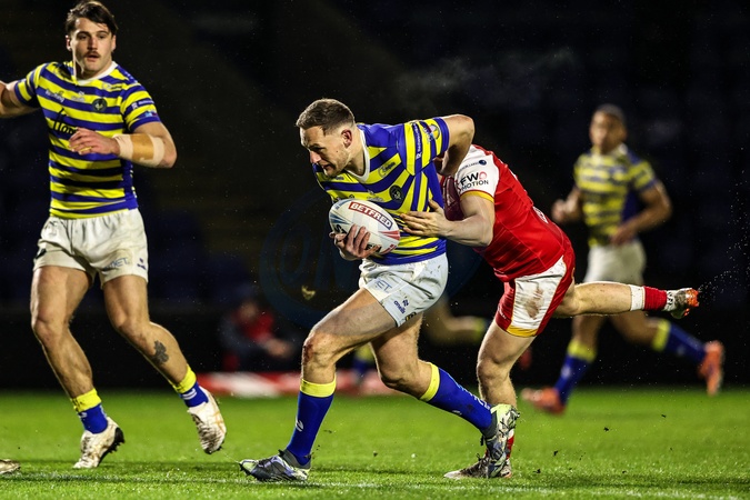 Ben Currie of Warrington Wolves is tackled during the Betfred Challenge Cup match Warrington Wolves vs Sheffield Eagles at The Halliwell Jones Stadium, Warrington, United Kingdom on 06 February 2026, Credit:Ae Cosgrove/News Images / Avalon