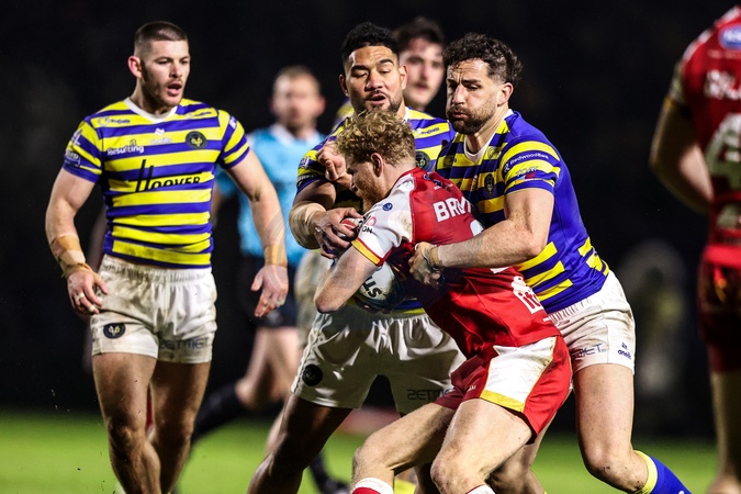 Kelepi Tanginoa of Warrington Wolves and Toby King of Warrington Wolves make a tackle during the Betfred Challenge Cup match Warrington Wolves vs Sheffield Eagles at The Halliwell Jones Stadium, Warrington, United Kingdom on 06 February 2026, Credit:Ae Cosgrove/News Images / Avalon