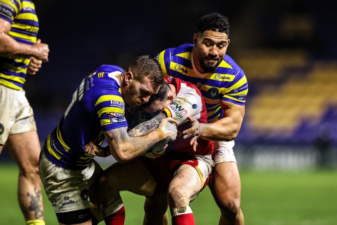Marc Sneyd of Warrington Wolves and Kelepi Tanginoa of Warrington Wolves make a tackle during the Betfred Challenge Cup match Warrington Wolves vs Sheffield Eagles at The Halliwell Jones Stadium, Warrington, United Kingdom on 06 February 2026, Credit:Ae Cosgrove/News Images / Avalon