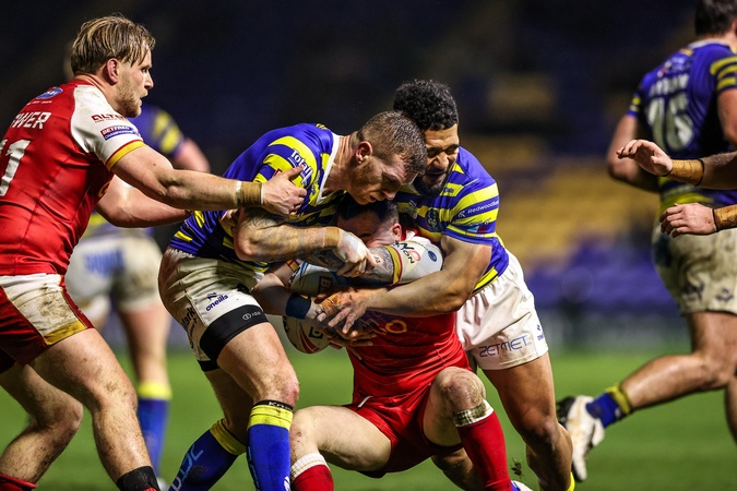 Marc Sneyd of Warrington Wolves and Kelepi Tanginoa of Warrington Wolves make a tackle during the Betfred Challenge Cup match Warrington Wolves vs Sheffield Eagles at The Halliwell Jones Stadium, Warrington, United Kingdom on 06 February 2026, Credit:Ae Cosgrove/News Images / Avalon