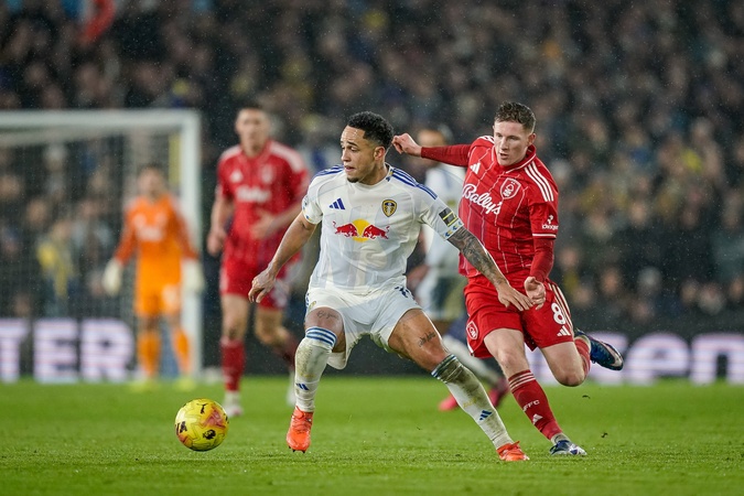 Noah Okafor of Leeds United battles for the ball with Elliot Anderson of Nottingham Forest during the Premier League match Leeds United vs Nottingham Forest at Elland Road, Leeds, United Kingdom on 06 February 2026, Credit:Maynard Manyowa/News Images / Avalon