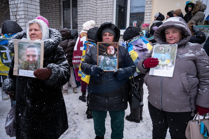 Women hold photographs of Ukrainian prisoners of war or those missing in action on a building wall so that Ukrainian servicemen and civilians released from Russian captivity can recognize them and provide information to families, Ukraine, on February 5, 2026. Ukraine has returned 157 Ukrainians from Russian captivity, including both military personnel and civilians, most of whom had been held since 2022, Credit:Danylo Antoniuk / Avalon