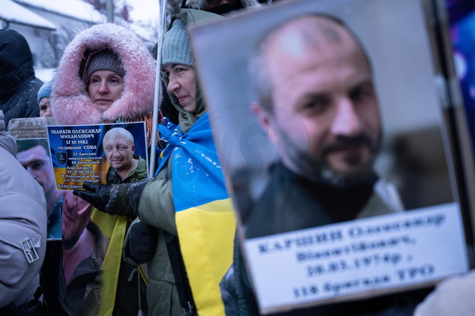 Women hold photographs of Ukrainian prisoners of war or those missing in action on a building wall so that Ukrainian servicemen and civilians released from Russian captivity can recognize them and provide information to families, Ukraine, on February 5, 2026. Ukraine has returned 157 Ukrainians from Russian captivity, including both military personnel and civilians, most of whom had been held since 2022, Credit:Danylo Antoniuk / Avalon