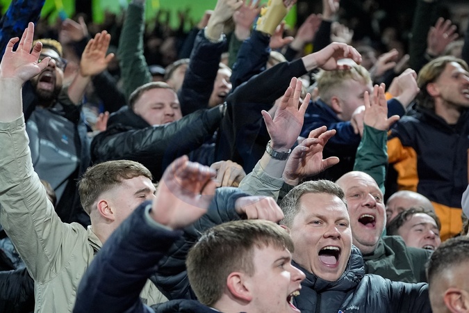 Leeds Unite fans celebrate their team's goal to make it 2-0 during the Premier League match Leeds United vs Nottingham Forest at Elland Road, Leeds, United Kingdom on 06 February 2026, Credit:Maynard Manyowa/News Images / Avalon
