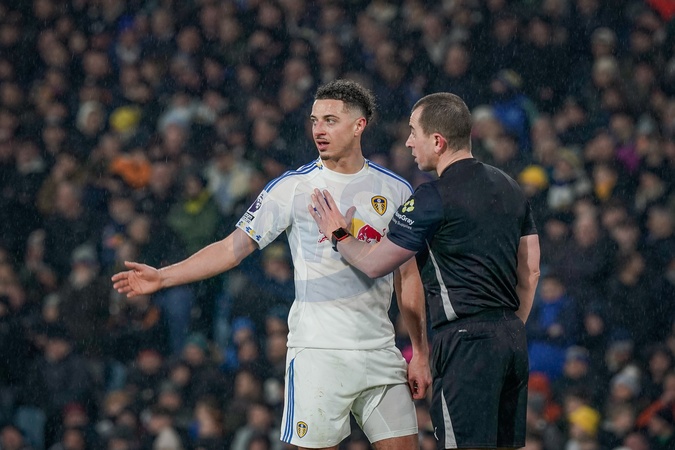 Ethan Ampadu of Leeds United speaks with Referee Peter Bankes during the Premier League match Leeds United vs Nottingham Forest at Elland Road, Leeds, United Kingdom on 06 February 2026, Credit:Maynard Manyowa/News Images / Avalon