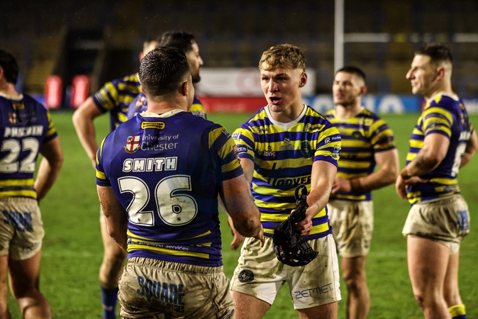 Josh Smith of Warrington Wolves and Tommy Rhodes of Warrington Wolves after the game during the Betfred Challenge Cup match Warrington Wolves vs Sheffield Eagles at The Halliwell Jones Stadium, Warrington, United Kingdom on 06 February 2026, Credit:Ae Cosgrove/News Images / Avalon