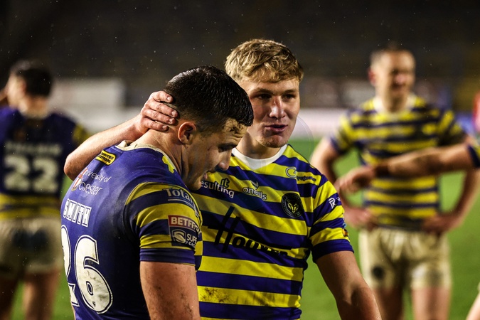 Josh Smith of Warrington Wolves and Tommy Rhodes of Warrington Wolves after the game during the Betfred Challenge Cup match Warrington Wolves vs Sheffield Eagles at The Halliwell Jones Stadium, Warrington, United Kingdom on 06 February 2026, Credit:Ae Cosgrove/News Images / Avalon