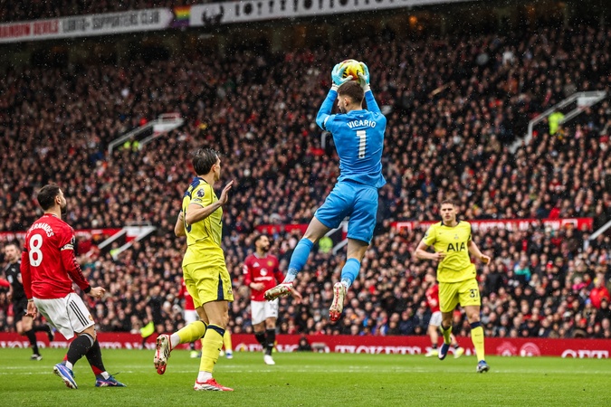 Tottenham Hotspur goalkeeper Guglielmo Vicario jumps up to win the high ball during the Premier League match Manchester United vs Tottenham Hotspur at Old Trafford, Manchester, United Kingdom on 07 February 2026, Credit:Ae Cosgrove/News Images / Avalon