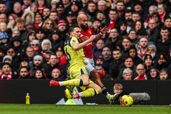 Bryan Mbeumo of Manchester United is tackled by Joao Palhinha of Tottenham Hotspur during the Premier League match Manchester United vs Tottenham Hotspur at Old Trafford, Manchester, United Kingdom on 07 February 2026, Credit:Ae Cosgrove/News Images / Avalon