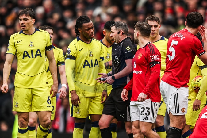 Destiny Udogie of Tottenham Hotspur appeals to referee Alejandro Michael Oliver during the Premier League match Manchester United vs Tottenham Hotspur at Old Trafford, Manchester, United Kingdom on 07 February 2026, Credit:Ae Cosgrove/News Images / Avalon