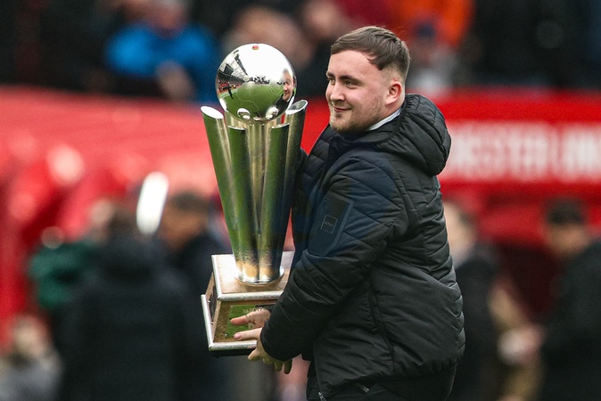 Luke ‘The Nuke' Littler shows his PDC World Championship trophy after winning it for his second consecutive year during the Premier League match Manchester United vs Tottenham Hotspur at Old Trafford, Manchester, United Kingdom on 07 February 2026, Credit:Ae Cosgrove/News Images / Avalon