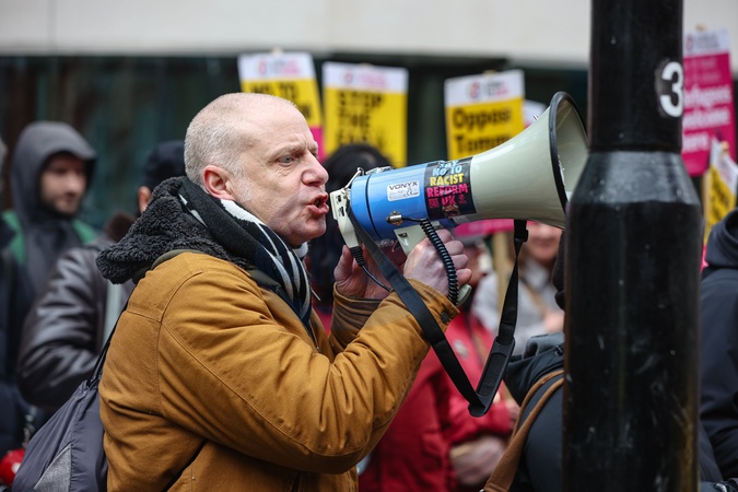 Stand Up to Racism protest against far-right Advance UK event outside Emmanuel Centre in Westminster, London, UK, on 07 February 2026