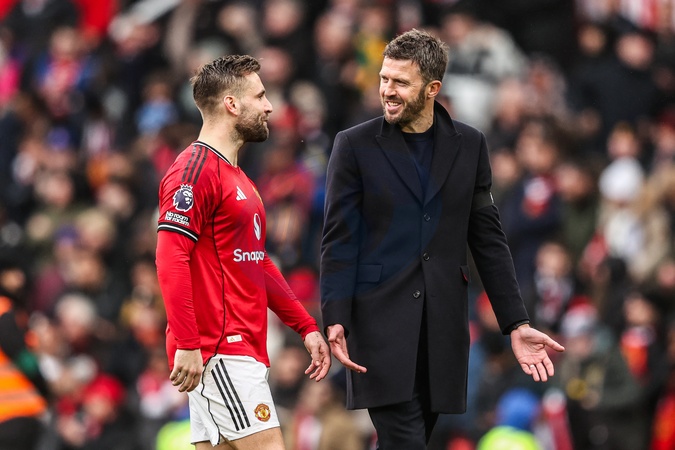 Luke Shaw of Manchester United and Michael Carrick manager of Manchester United after the game during the Premier League match Manchester United vs Tottenham Hotspur at Old Trafford, Manchester, United Kingdom on 07 February 2026, Credit:Ae Cosgrove/News Images / Avalon