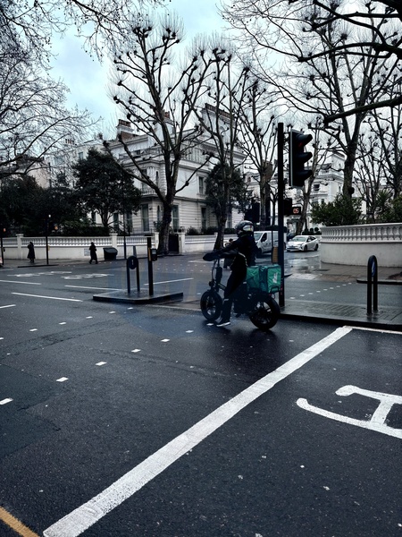 London, UK. 7 February 2026. A food delivery rider waits at traffic lights on a junction in Kensington, west London, during rainy winter conditions., Credit:Alexander Seale / Avalon