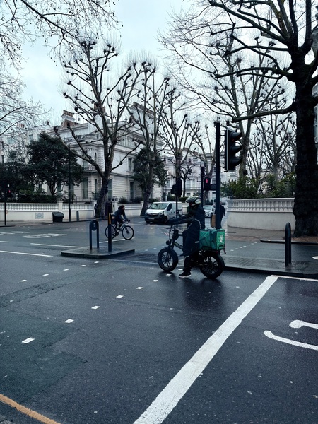 London, UK. 7 February 2026. A food delivery rider waits at traffic lights on a junction in Kensington, west London, during rainy winter conditions., Credit:Alexander Seale / Avalon