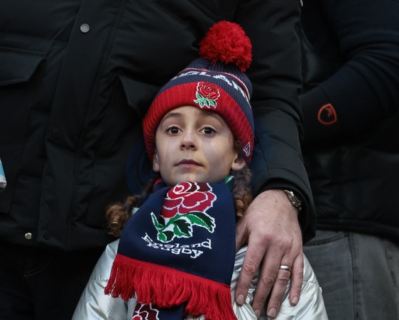 A young England fan with matching hat and scarf during the Guinness Six Nations 2026 match England vs Wales at Allianz Stadium, Twickenham, United Kingdom on 07 February 2026, Credit:Mark Cosgrove/News Images / Avalon