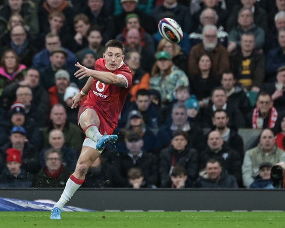 Josh Adams of Wales kicks up field during the Guinness Six Nations 2026 match England vs Wales at Allianz Stadium, Twickenham, United Kingdom on 07 February 2026, Credit:Mark Cosgrove/News Images / Avalon