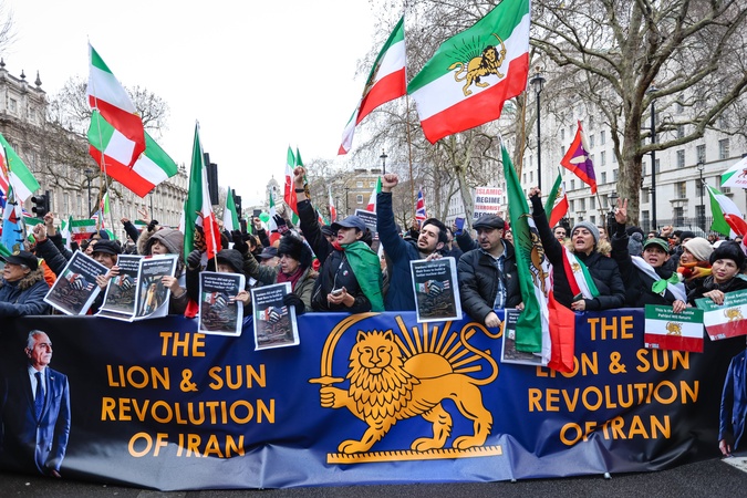 Protesters march through central London before gathering outside Downing Street in London, UK, on 07 February 2026, supporting the uprising in Iran and calling for the reinstatement of Crown Prince Reza Pahlavi., Credit:Pete Speller / Avalon