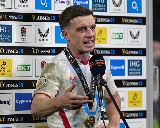 George Ford of England and man of the match speaks in a post match interview during the Guinness Six Nations 2026 match England vs Wales at Allianz Stadium, Twickenham, United Kingdom on 07 February 2026, Credit:Mark Cosgrove/News Images / Avalon