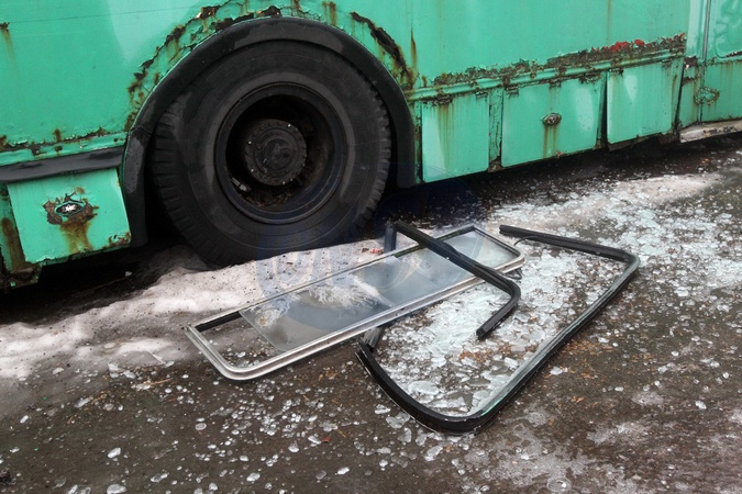 Shattered windows lie on the ground by a trolleybus at a depot after a Russian drone strike, Dnipro, Ukraine, February 7, 2026. On the night of February 7, the Russian army launched more than 400 drones and about 40 missiles across Ukraine, targeting energy and civil infrastructure. In Dnipro, 18 passenger trolleybuses, one service vehicle, and other transport were damaged at a depot, while administrative buildings and heating systems were also affected., Credit:Mykola Miakshykov / Avalon