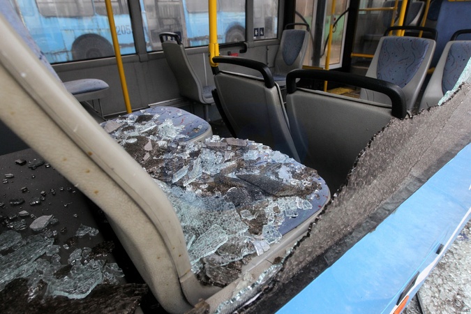 Glass shards cover the seat inside a trolleybus at a depot after a Russian drone strike, Dnipro, Ukraine, February 7, 2026. On the night of February 7, the Russian army launched more than 400 drones and about 40 missiles across Ukraine, targeting energy and civil infrastructure. In Dnipro, 18 passenger trolleybuses, one service vehicle, and other transport were damaged at a depot, while administrative buildings and heating systems were also affected., Credit:Mykola Miakshykov / Avalon