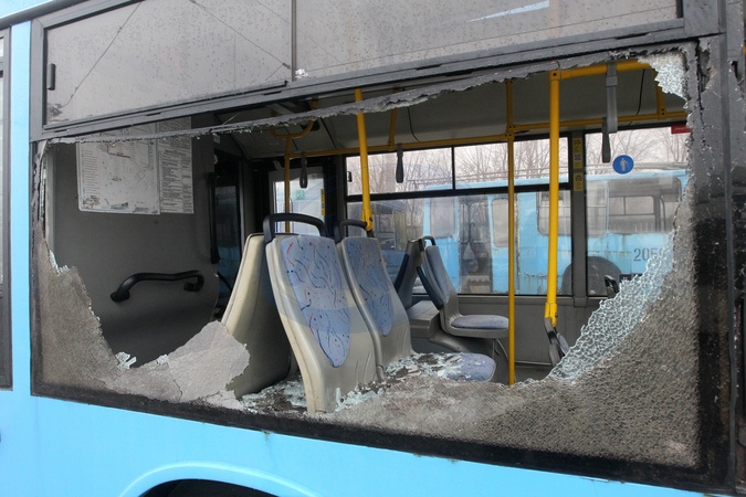 A trolleybus window shattered by a Russian drone strike frames the rows of seats, Dnipro, Ukraine, February 7, 2026. On the night of February 7, the Russian army launched more than 400 drones and about 40 missiles across Ukraine, targeting energy and civil infrastructure. In Dnipro, 18 passenger trolleybuses, one service vehicle, and other transport were damaged at a depot, while administrative buildings and heating systems were also affected., Credit:Mykola Miakshykov / Avalon