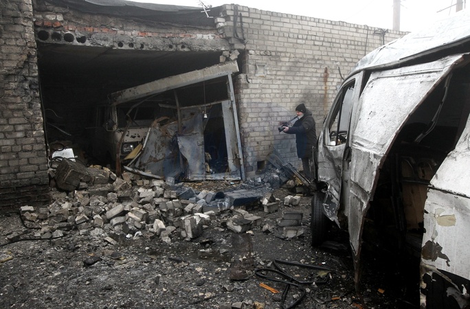 A man takes photos of damage caused by a Russian drone strike at a depot, Dnipro, Ukraine, February 7, 2026. On the night of February 7, the Russian army launched more than 400 drones and about 40 missiles across Ukraine, targeting energy and civil infrastructure. In Dnipro, 18 passenger trolleybuses, one service vehicle, and other transport were damaged at a depot, while administrative buildings and heating systems were also affected., Credit:Mykola Miakshykov / Avalon