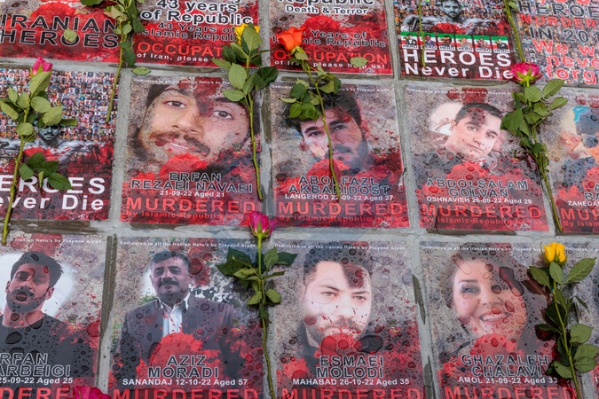 Trafalgar Square, London, UK. 7th February 2026.A 'Stop The Genocide' Exhibition to honour and remember those killed by the government of the Islamic Republic of Iran over the 47 years since the Islamic Revolution in 1979.Hundreds of photographs and personal objects were surrounded by candles and flowers.Many images included some of the estimated 90,000 killed during the current genocide by the regime; 12,000 - 36,500 of those are thought to have been killed over the Jan 8th-9th crackdown on the current protests., Credit:Photo by Amanda Rose / Avalon