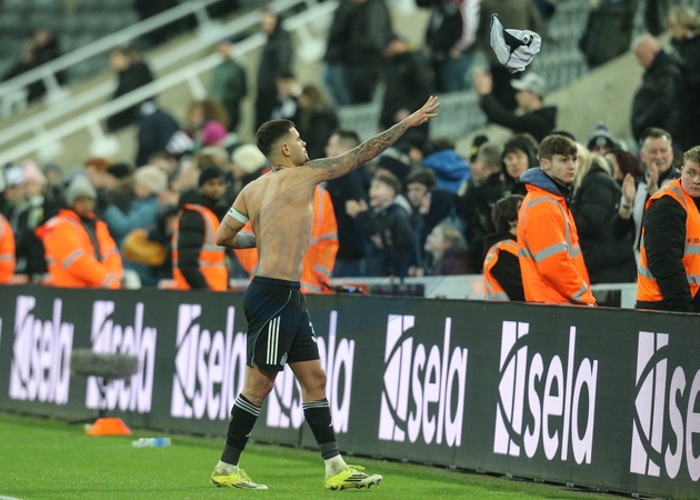 Bruno Guimaraes of Newcastle United gives his shirt to a young fan during the Premier League match Newcastle Untied vs Brentford at St. James's Park, Newcastle, United Kingdom on 07 February 2026, Credit:Richard Bierton/News Images / Avalon