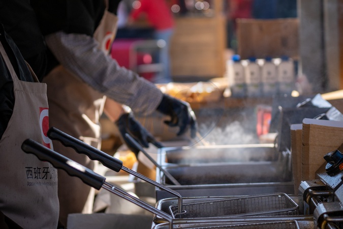 Para esta foto, que seguramente tiene mucho movimiento, vapor o acción, el caption debe resaltar la energía del "detrás de escena" de la feria gastronómica. Aquí tienes las opciones para los metadatos:Opción 1: Enfoque en la Acción y el Trabajo (Ideal para fotoperiodismo)Caption: "Chinese chefs multitasking and managing deep fryers at a busy food stall during the 2026 Chinese New Year celebrations in Barcelona, Credit:© 2026 Ivan Sánchez Jiménez / Avalon