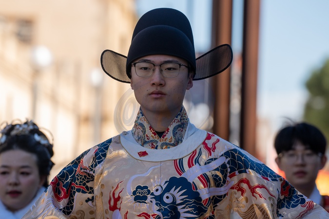 A man dressed in traditional Chinese attire participating in the 2026 Lunar New Year celebrations in Barcelona, Credit:© 2026 Ivan Sánchez Jiménez / Avalon