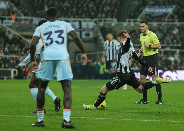 Harvey Barnes of Newcastle United takes a shot on goal during the Premier League match Newcastle Untied vs Brentford at St. James's Park, Newcastle, United Kingdom on 07 February 2026, Credit:Richard Bierton/News Images / Avalon