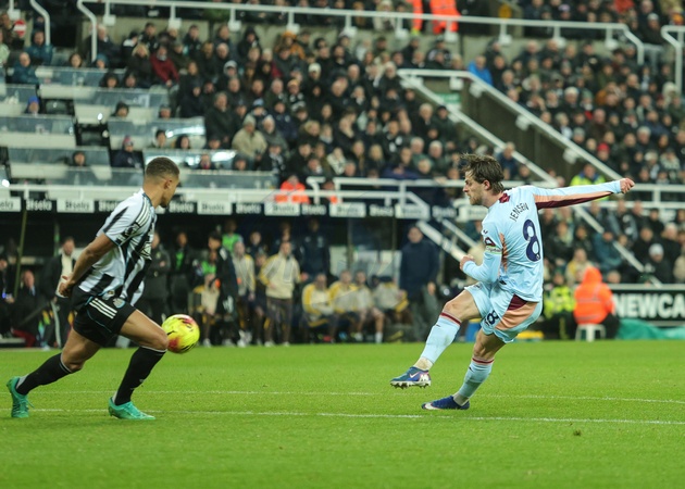 Mathias Jensen of Brentford takes a shot on goal during the Premier League match Newcastle Untied vs Brentford at St. James's Park, Newcastle, United Kingdom on 07 February 2026, Credit:Richard Bierton/News Images / Avalon