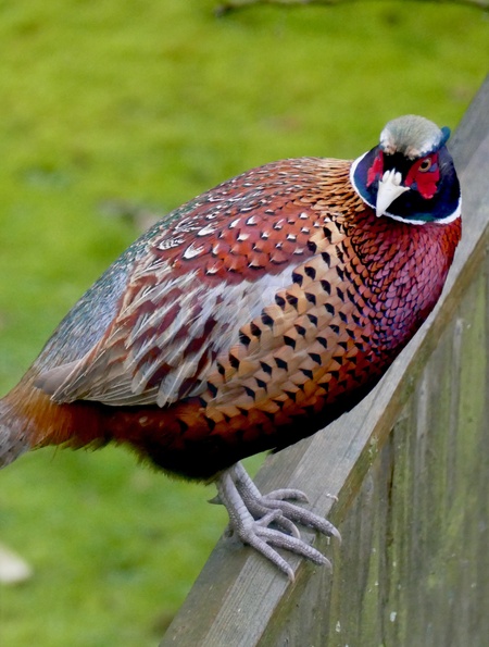 A male Phesant (Phasianus colchicus) ventures off of the beaten track to perch on a garden fence looking for food., Credit:Geoffrey Swaine / Avalon