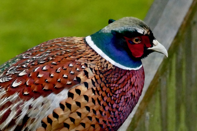A male Phesant (Phasianus colchicus) ventures off of the beaten track to perch on a garden fence looking for food., Credit:Geoffrey Swaine / Avalon