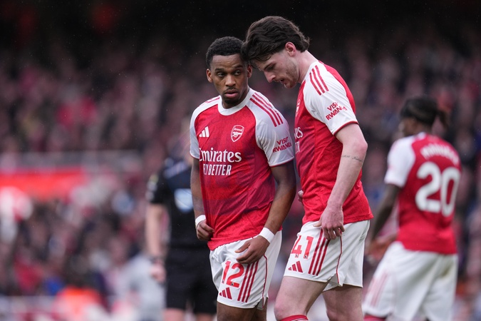 Jurrien Timber of Arsenal and Declan Rice of Arsenal during the Premier League match Arsenal vs Sunderland at Emirates, London, United Kingdom on 07 February 2026, Credit:Harvey Murphy/News Images / Avalon
