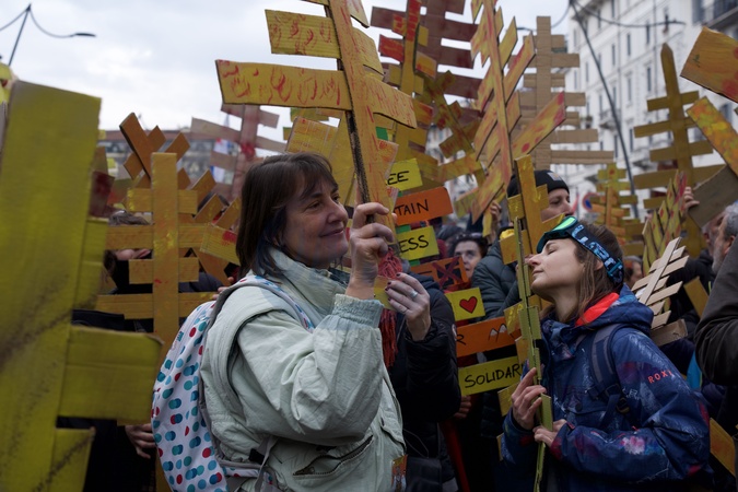 National demonstration "Let's take back our cities, let's free the mountains - Against the most unsustainable Olympic Games ever," organized in protest at the first day of competition at the Milan-Cortina Winter Olympics. In the photo, protesters hold up cardboard trees in homage to the larch forest cut down to build a new bobsleigh track for the games. Milan. Italy 07 Feb 2026, Credit:Selene Daniele/AGF / Avalon