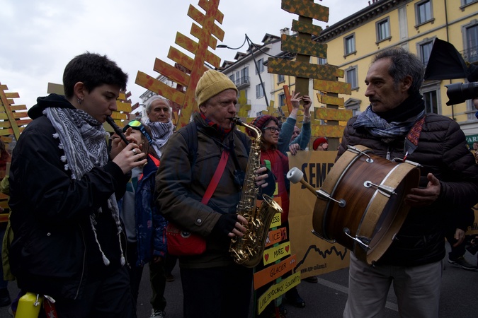 National demonstration "Let's take back our cities, let's free the mountains - Against the most unsustainable Olympic Games ever," organized in protest at the first day of competition at the Milan-Cortina Winter Olympics. In the photo, protesters hold up cardboard trees in homage to the larch forest cut down to build a new bobsleigh track for the games. Milan. Italy 07 Feb 2026, Credit:Selene Daniele/AGF / Avalon