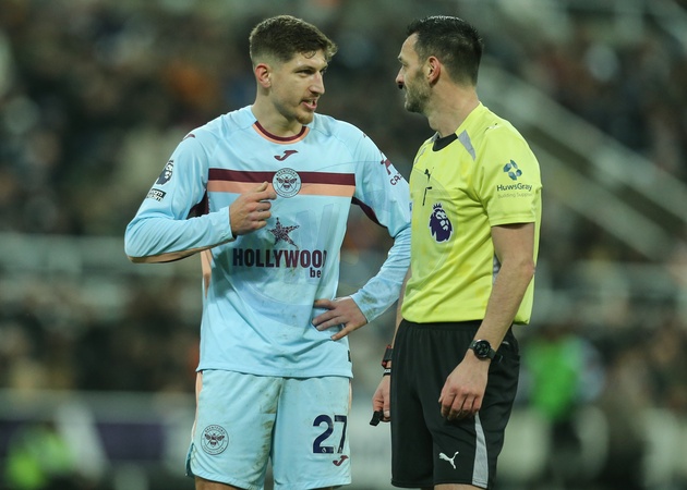 referee Andrew Madley in discussion with Vitaly Janelt of Brentford during the Premier League match Newcastle Untied vs Brentford at St. James's Park, Newcastle, United Kingdom on 07 February 2026, Credit:Richard Bierton/News Images / Avalon
