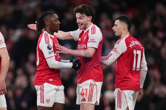 Declan Rice of Arsenal and Eberechi Eze of Arsenal after third goal during the Premier League match Arsenal vs Sunderland at Emirates, London, United Kingdom on 07 February 2026, Credit:Harvey Murphy/News Images / Avalon