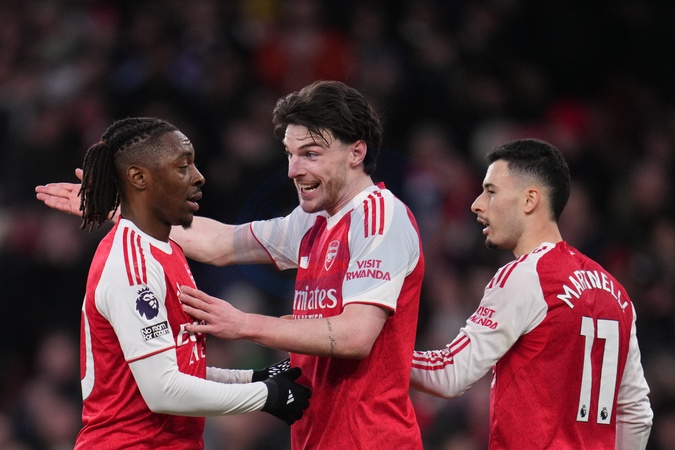Declan Rice of Arsenal and Eberechi Eze of Arsenal during the Premier League match Arsenal vs Sunderland at Emirates, London, United Kingdom on 07 February 2026, Credit:Harvey Murphy/News Images / Avalon