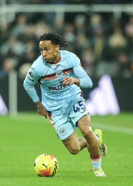 Romelle Donovan of Brentford breaks down the wing during the Premier League match Newcastle Untied vs Brentford at St. James's Park, Newcastle, United Kingdom on 07 February 2026, Credit:Richard Bierton/News Images / Avalon