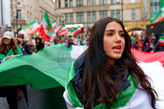 Stage Of Freedom organised March for a Free Iran protest. The large protest mustered at Marble Arch and marched to a rally in Downing Street which featured a stage with speakers and singers., Credit:Aldo Ciarrocchi / Avalon