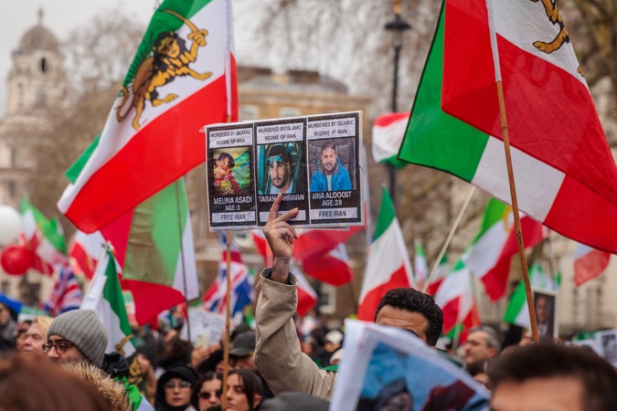 Whitehall, London, UK. 7th February 2026.Members of the Iranian community march through London, arranged by activist group 'Stage of Freedom' in support of 'The Lion and Sun Revolution' - an uprising that started in Iran on Dec 28th 2025, with protests against the Islamic Republic and the return of Pahlavi as their King., Credit:Photo by Amanda Rose / Avalon