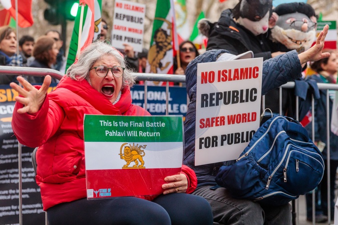 Whitehall, London, UK. 7th February 2026.Emotional members of the Iranian community at a rally organised activist group 'Stage of Freedom' in support of 'The Lion and Sun Revolution' - an uprising that started in Iran on Dec 28th 2025, with protests against the Islamic Republic and the return of Pahlavi as their King., Credit:Photo by Amanda Rose / Avalon