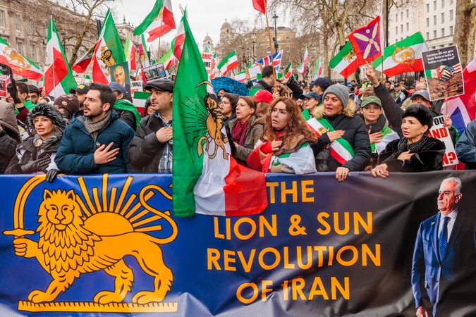 Whitehall, London, UK. 7th February 2026.Members of the Iranian community march through London, arranged by activist group 'Stage of Freedom' in support of 'The Lion and Sun Revolution' - an uprising that started in Iran on Dec 28th 2025, with protests against the Islamic Republic and the return of Pahlavi as their King., Credit:Amanda Rose / Avalon